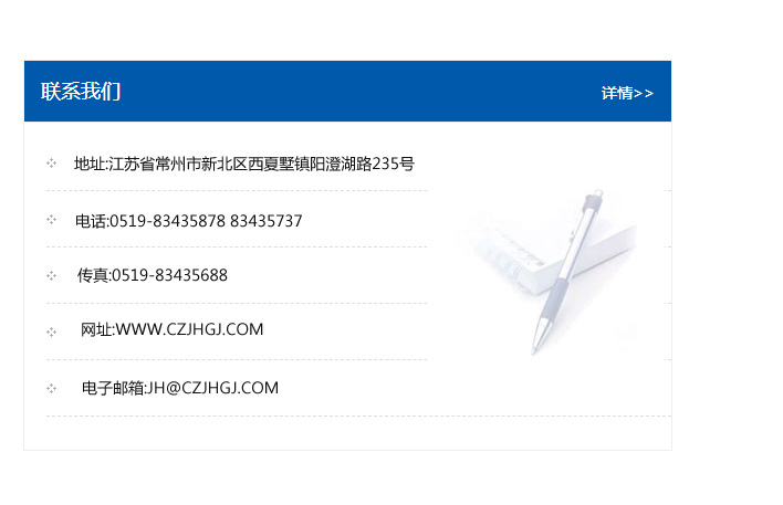 地址:常州市新北區友邦商務大廈1幢16、17層  電話:0519-85101652  傳真:0519-85112595  郵編:213022  網址:www.cz-jiayue_cn.zjxbxj.com  郵箱:xiajifengaa@163.com